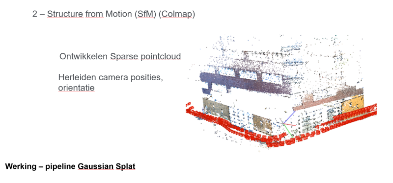 Het basisprincipe is verrassend simpel: met een camera (of video) maak je een serie overlappende foto’s van een ruimte, object of gebouw. Via een specifiek algoritme (structure from motion) wordt een grove 3d-puntenwolk gecreëerd op basis van gemeenschappelijke beeldpunten in de foto’s of video. Deze grove puntenwolk (sparse pointcloud) vorm de basis voor de vervolgstap. Op de punten worden zogenaamde 3d-gaussians geprojecteerd die aanvankelijk nog zeer grof overeenkomen met het specifieke fotobeeld vanuit een specifieke beeldhoek. Deze gaussians zijn driedimensionale ellipsoïden of ‘blobs’ met een eigen richting, kleur en transparantie. Een trainingsalgoritme zorgt er vervolgens voor dat de ‘blobs’ steeds beter gaan matchen met de originele foto’s vanuit de verschillende standpunten. Je ziet dat het model zich steeds meer verfijnt tot een replica van de originele fotoset, maar nu kan je in deze 3d-ruimte bestaande uit miljoenen ‘blobs’ of gaussians zelf navigeren.